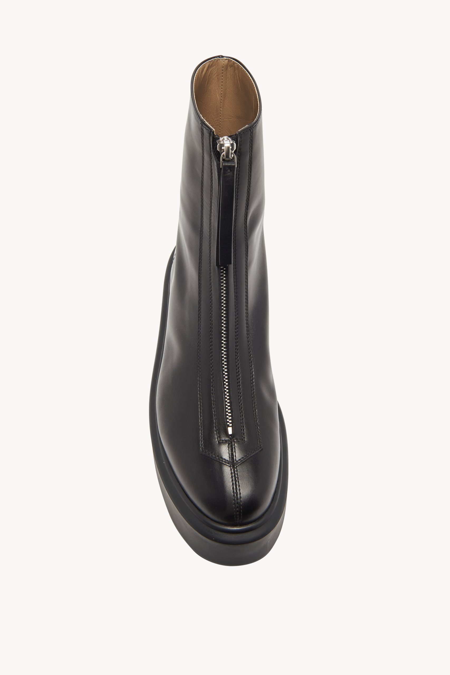 Utilitarian ankle boot in smooth calfskin leather with front zip and thick crepe sole.